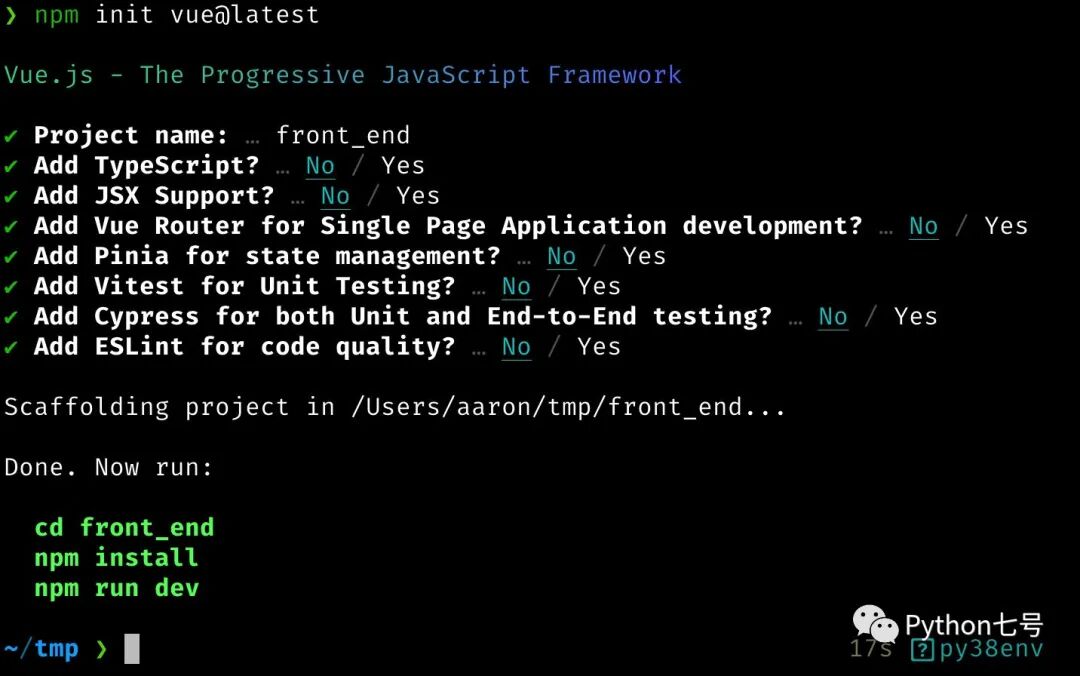 这将后自动安装 Vue 的最新版本,并初始化一个 Vue 项目,填写一个项目名称,其它都直接回车按默认值处理即可: